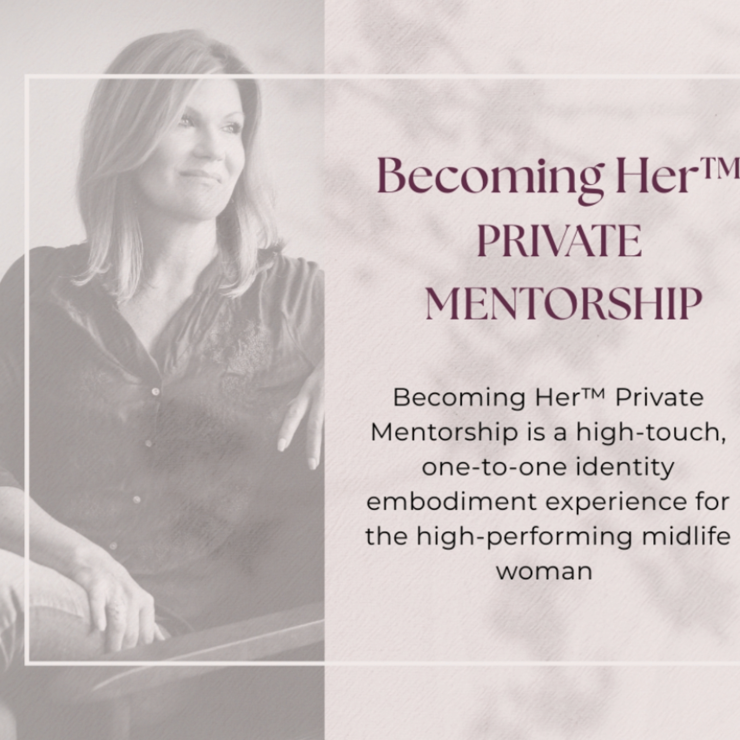 Becoming Her⢠Private Mentorship is a high-touch, one-to-one identity-embodiment experience for the high-performing midlife woman ready to consciously design and live her next chapter.